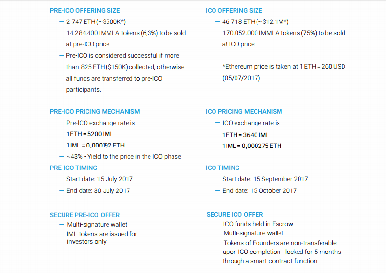 IMMLA will offer 184,336,400 IMMLA tokens in two levels: pre-lco and ICO.